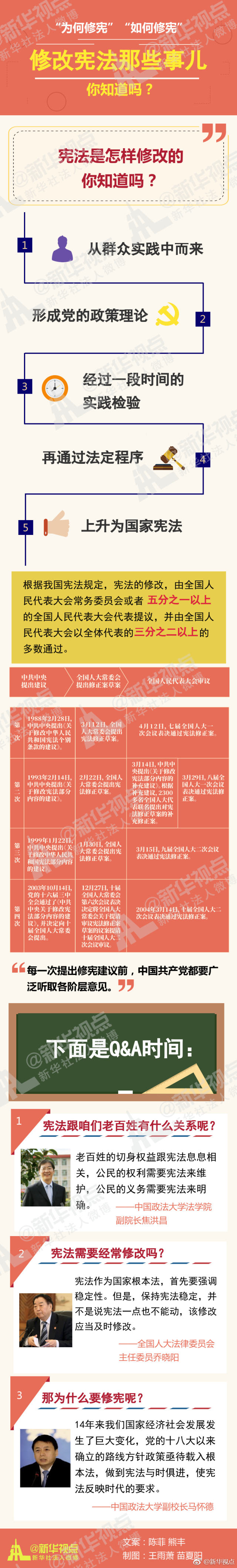 [修改宪法那些事儿,你知道吗?]《中共中央关于修改宪法部分内容的建议》在刚刚闭幕的十九届二中全会审议通过。这是时隔14年我国再次启动修宪。宪法是国家的根本法,是治国安邦的总章程,是党和人民意志的集中体现。宪法修改是国家政治生活中的一件大事。这么重要的根本法,是怎样修改的你知道吗?