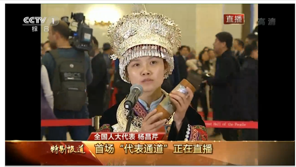 身穿民族服饰的全国人大代表,赤水市大同镇民族村农民、赤水市牵手竹艺发展有限公司负责人杨昌芹,带了一个水杯走上代表通道,这个看似普通的喝水杯,是杨昌芹和村民们脱贫攻坚的一个工具。一个竹编能赚100元,竹编工艺帮助了少数民族脱贫致富,使民族村全村80%的人住上小洋楼,60%的人开上了小汽车。