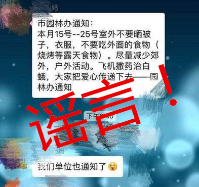 “飞机撒药治白蛾”是一条阶段性谣言,每年春天,网络上都会出现类似的谣言,给公众造成巨大误导和恐慌。针对这种反复出现的谣言,单辟谣是不够的,还应该建立长效机制,进行预防和阻止。