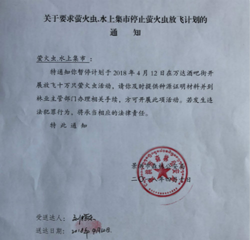 据报道,4月9日,一个账号主体为云南某企业的微信公众号发布消息称,12日至17日将在西双版纳州景洪市举办“酒吧街十万萤火虫放飞”活动,引起景洪市森林公安局等相关部门注意。办方拟放飞的这批萤火虫尚未运到景洪市。萤火虫向湖南一家公司购买,该公司和活动主办方尚未办理包括“运输许可证”在内的审批手续。因此被依法叫停。