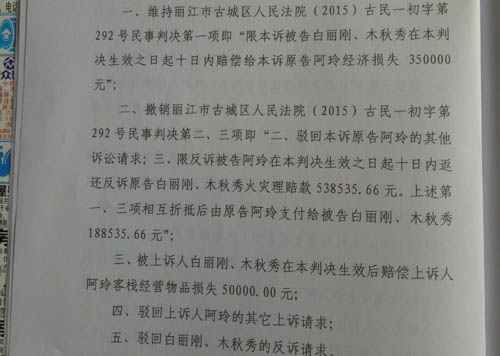 被房东毁约驱赶已经20个月的丽江客栈老板阿玲,迎来了新的转机。5月10日,丽江市中级人民法院终审判决书显示,客栈老板阿玲与房东白丽刚夫妇的租赁合同至今合法有效,白丽刚夫妇拆除客栈部分房屋对阿玲造成损失需赔偿400000元。(5月23日 澎湃新闻)
