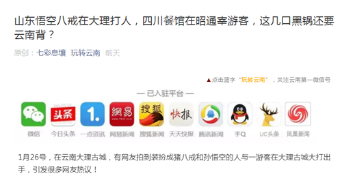 1月29日,微信公众号“玩转云南”发布文章《山东悟空八戒在大理打人,四川餐馆在昭通宰游客,这几口黑锅还要云南背?》。文章转载了官方对“大理古城装扮成猪八戒和孙悟空的人与游客大打出手”“四川游客到云南旅游遇短斤缺两”两起事件的通报。证实上述在云南宰客欺客的人,是外地人而非本地人。