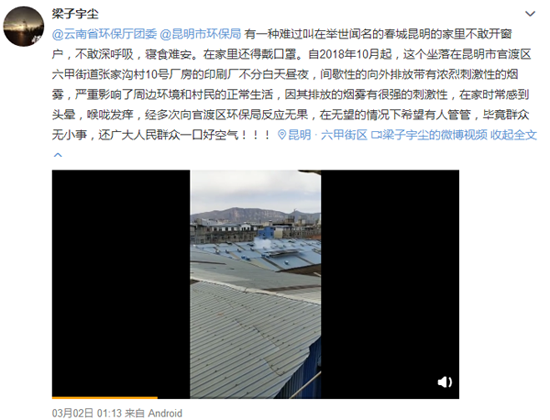 4月23日,记者回访张家沟村内印刷厂排放刺鼻烟雾一事了解到,虽然烟雾排放次数减少了,但仍有刺鼻味道。昆明市生态环境局官渡分局(以下简称“官渡分局”)工作人员回复,印刷厂已经按照要求整改排烟管道,整改得合不合格,改天再去问问。(4月24日《都市时报》)