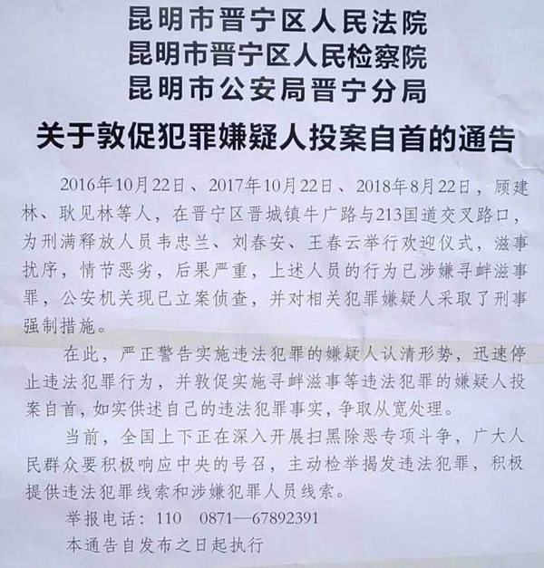 昆明警方向记者证实,4月22日网传的一份由昆明市晋宁区法院、检察院、公安分局联合发布的《关于敦促犯罪嫌疑人投案自首的通告》属实。该通报称晋宁区多人曾为刑满释放人员举行欢迎仪式,滋事扰序,情节恶劣后果严重,被采取刑事强制措施。(4月24日人民日报客户端)