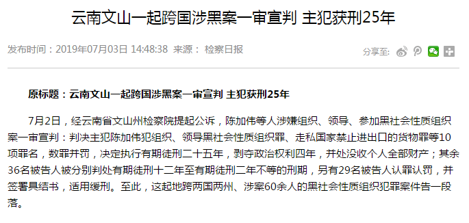 7月2日,经文山州检察院提起公诉,陈加伟等人涉嫌组织、领导、参加黑社会性质组织案一审宣判。而这一涉黑集团挖山建5条走私通道的背后,竟有“保护伞”多达20人。(7月3日 云南网)