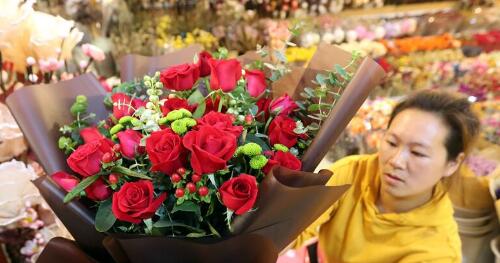 在昆明岔街花市,鲜花经营户正在忙着制作“七夕”玫瑰主题花束