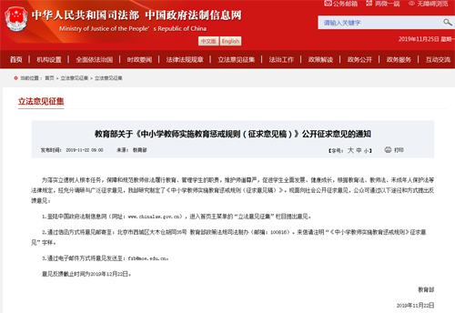 22日,教育部发布关于《中小学教师实施教育惩戒规则(征求意见稿)》公开征求意见的通知。