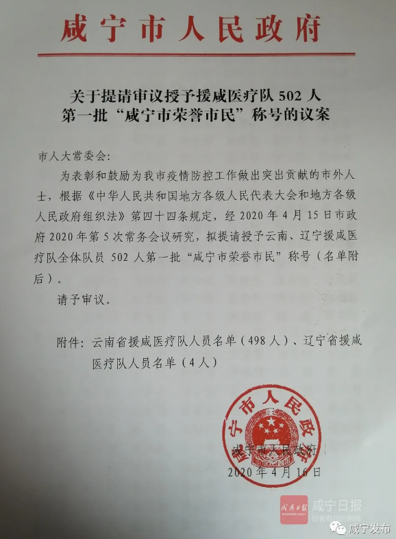 4月21日,咸宁市召开市五届人大常委会第二十三次会议,会上表决通过了咸宁市政府关于提请授予援咸医疗队502人“咸宁市荣誉市民”称号的议案。据悉,援咸医疗队共计502人,其中云南医疗队498人,辽宁医疗队4人,均非咸宁籍人士。他们在咸宁市疫情防控最吃紧的时候,不畏艰险,逆行出征,千里驰援,奔赴咸宁“战疫”一线。