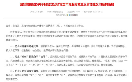 习近平总书记强调,必须把提高脱贫质量放在首位,打好精准脱贫攻坚战。《通知》聚焦脱贫攻坚领域,聚力克服形式主义官僚主义问题,这是贯彻落实习近平总书记在决战决胜脱贫攻坚座谈会上的重要讲话精神,将中共中央办公厅《关于持续解决困扰基层的形式主义问题为决胜全面建成小康社会提供坚强作风保证的通知》,在脱贫攻坚领域具体细化落实的重要体现。
