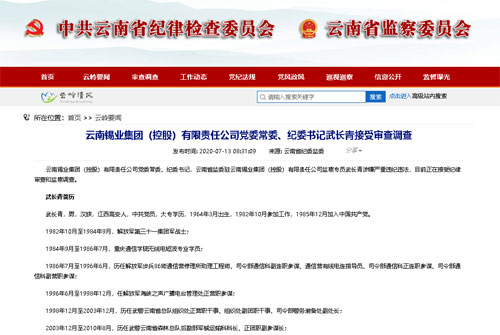 云南锡业集团(控股)有限责任公司党委常委、纪委书记,云南省监委驻云南锡业集团(控股)有限责任公司监察专员武长青涉嫌严重违纪违法,目前正在接受纪律审查和监察调查。