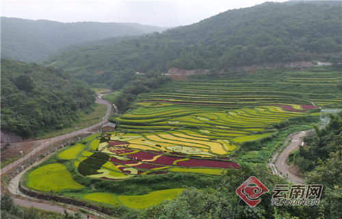 山地梯田中种植的七彩水稻。云南网记者 龙舟 周世兴 李春华 摄。