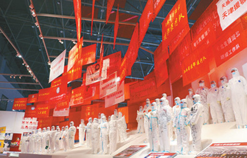 图为“八方支援 共克时艰”展区,援助湖北医护人员人物模型。 金雨蒙摄。