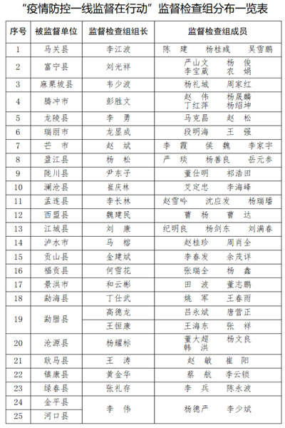为进一步压紧压实疫情防控责任,自4月12日起,云南省纪委省监委将派出监督检查组分赴25个边境县(市),对下沉一线督促外防输入责任落实情况、应对突发疫情演练和处置准备工作情况等开展专项监督。