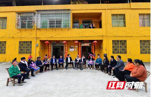 瑶民新居屋前,干群围坐一圈。(摄影/曹莉媛)