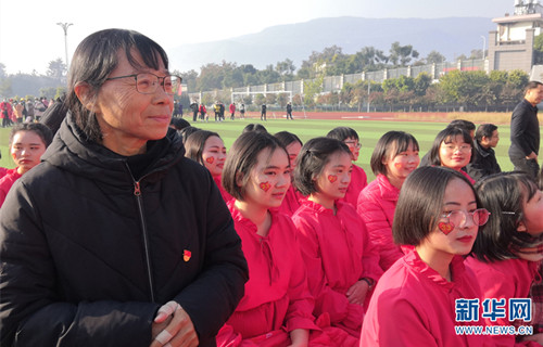 2021年1月1日,华坪女子高级中学举行红歌赛,张桂梅和学生们在一起。新华网发 王秀丽 摄。