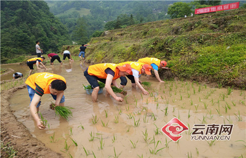 云南水富党旗下那弯腰的身影好靓丽。云南网记者 杨长亲 摄。