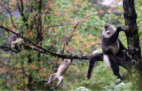 这是2020年5月23日在云南省迪庆藏族自治州香格里拉滇金丝猴国家公园里拍摄的滇金丝猴。新华社记者 王长山 摄。