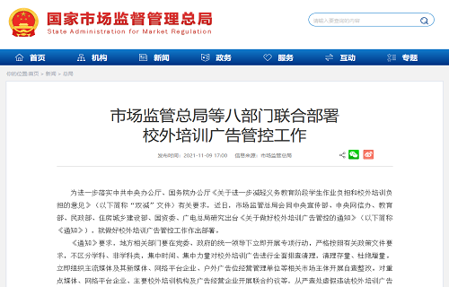 为进一步落实中共中央办公厅、国务院办公厅《关于进一步减轻义务教育阶段学生作业负担和校外培训负担的意见》有关要求,近日,市场监管总局会同中央宣传部、中央网信办、教育部、民政部、住房和城乡建设部、国资委、国家新闻出版广电总局研究出台《关于做好校外培训广告管控的通知》,就做好校外培训广告管控工作作出部署。