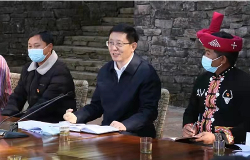 11月20日,省委副书记、省长王予波深入保山市腾冲市清水乡司莫拉佤族村,宣讲党的十九届六中全会精神。