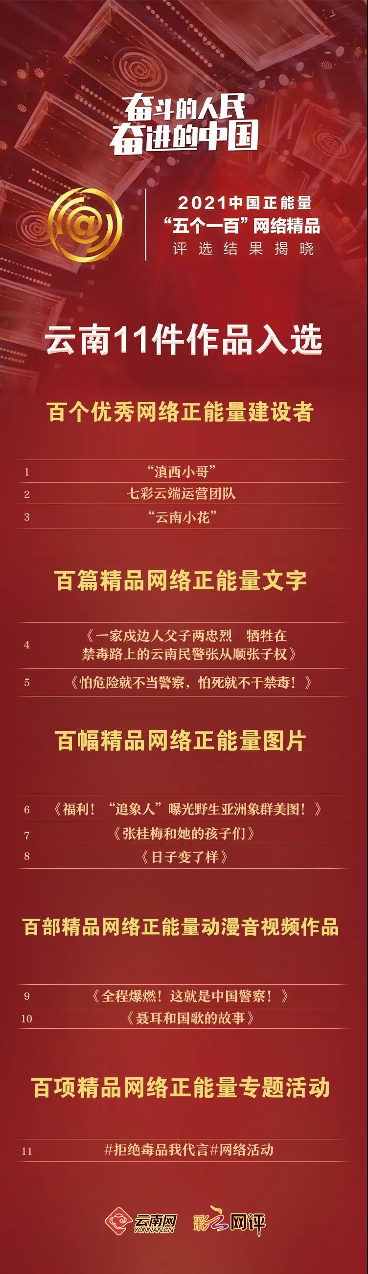 1月28日晚,“我,就是中国——2021中国正能量‘五个一百’网络精品年度发布盛典”,在央视综合频道和网络平台播出,盛典隆重回顾了中国互联网令人感动的百个优秀网络正能量建设者、百篇精品网络正能量文字、百幅精品网络正能量图片、百部精品网络正能量动漫音视频作品和百项精品网络正能量专题活动。其中,“滇西小哥”“云南小花”《一家戍边人父子两忠烈 牺牲在禁毒路上的云南民警张从顺张子权》《怕危险就不当警察,怕死就不干禁毒!》《张桂梅和她的孩子们》《全程爆燃!这就是中国警察!》等十一件优秀作品/账号入选“五个一百”,入选总数在全国名列前茅。