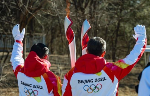 2月2日,北京2022年冬奥会火炬接力在北京奥林匹克森林公园开启。图为两名火炬手接力后挥手致意