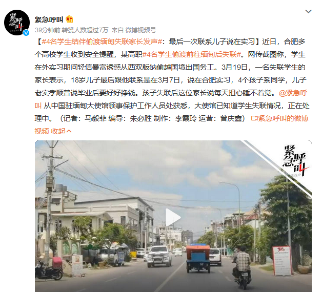 近日,合肥多所高校学生收到安全提醒,某高职院校4名学生在外实习期间轻信暴富诱惑,从西双版纳偷越国境外出务工,前往缅甸后失联,请其他学生提高警惕。此事引起社会广泛关注,目前警方表示正在调查。