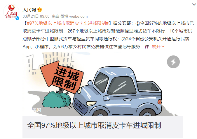 去年以来,公安部部署全国公安机关围绕中心、服务大局,先后推出了推进行政管理服务改革优化营商环境30项重点措施、服务经济社会发展助力稳住经济大盘10项重点措施等一系列改革措施。其中,在全力助企纾困解难、培育激发市场活力方面,落实便利货车在城市道路通行有关措施,全国97%的地级以上城市已取消皮卡车进城限制,267个地级以上城市对新能源轻型厢式货车不限行,10个城市试点赋予部分中型厢式货车与轻型货车同等通行权。