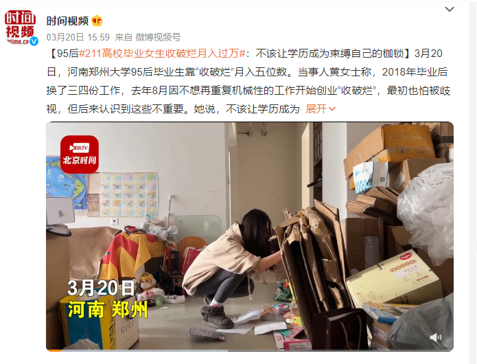近日,河南郑州大学95后毕业生靠创业“收破烂”月入五位数冲上热搜榜,引发舆论关注。引发大多数网民关心和关注的,不是月入五位数,而是大学生“收破烂”。