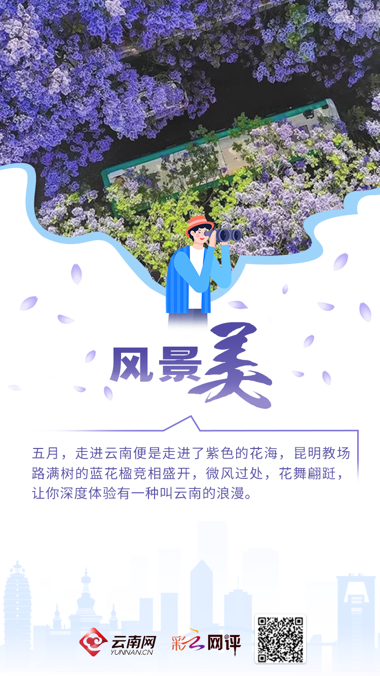 五月,走进云南便是走进了紫色的花海,昆明教场路满树的蓝花楹竞相盛开,微风过处,花舞翩跹,让你深度体验有一种叫云南的浪漫。
