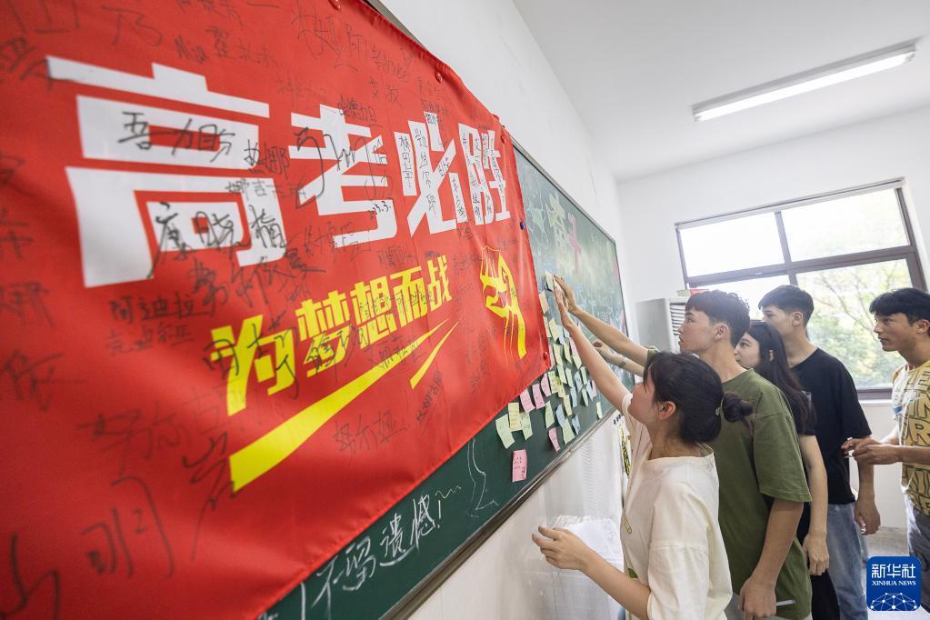 高三学生在黑板上粘贴高考寄语。伊凡 摄