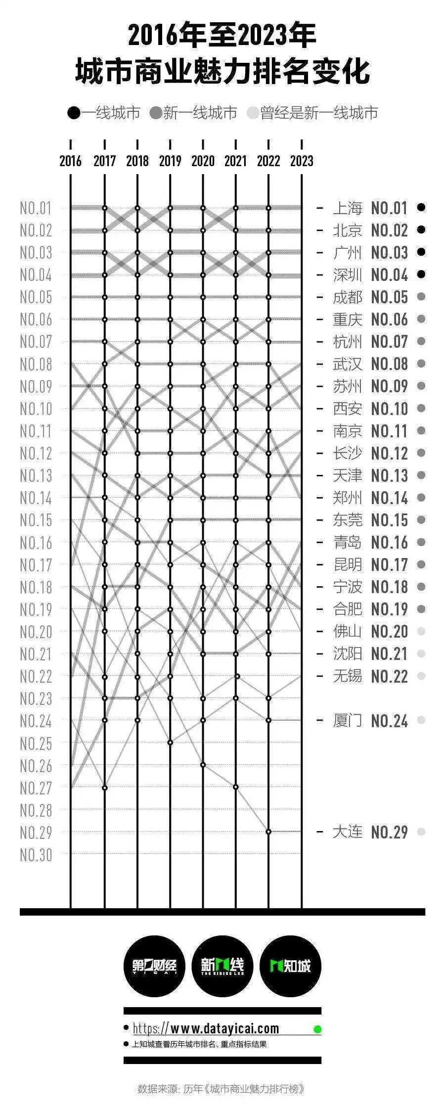 5月30日,第一财经旗下城市数据研究项目新一线城市研究所在上海发布《2023城市商业魅力排行榜》。在纳入榜单评估的中国内地337座地级及以上城市中,15座新一线城市依次为成都、重庆、杭州、武汉、苏州、西安、南京、长沙、天津、郑州、东莞、青岛、昆明、宁波和合肥。