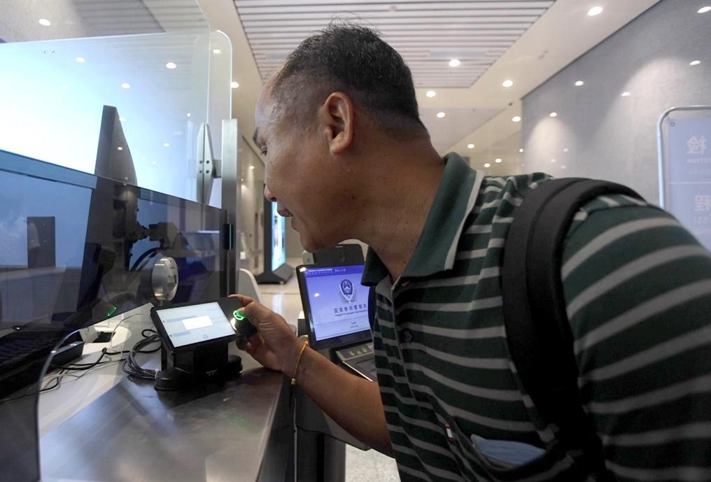 乘坐中老铁路入境的旅客使用智能翻译机与移民警察交流(8月11日摄)。新华社发