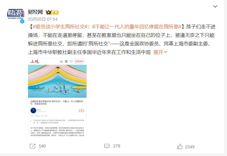 孩子们走不进操场,不能在走道里停留,甚至在教室里也只能坐在自己的位子上,被逼无奈之下只能躲进厕所里社交,即所谓的“厕所社交”——这是全国政协委员、民革上海市委副主委、上海市中华职教社副主任李国华近年来在工作和生活中观察到的独特现象。他呼吁:“不能让这一代人的童年回忆,就此停留在了厕所里。”