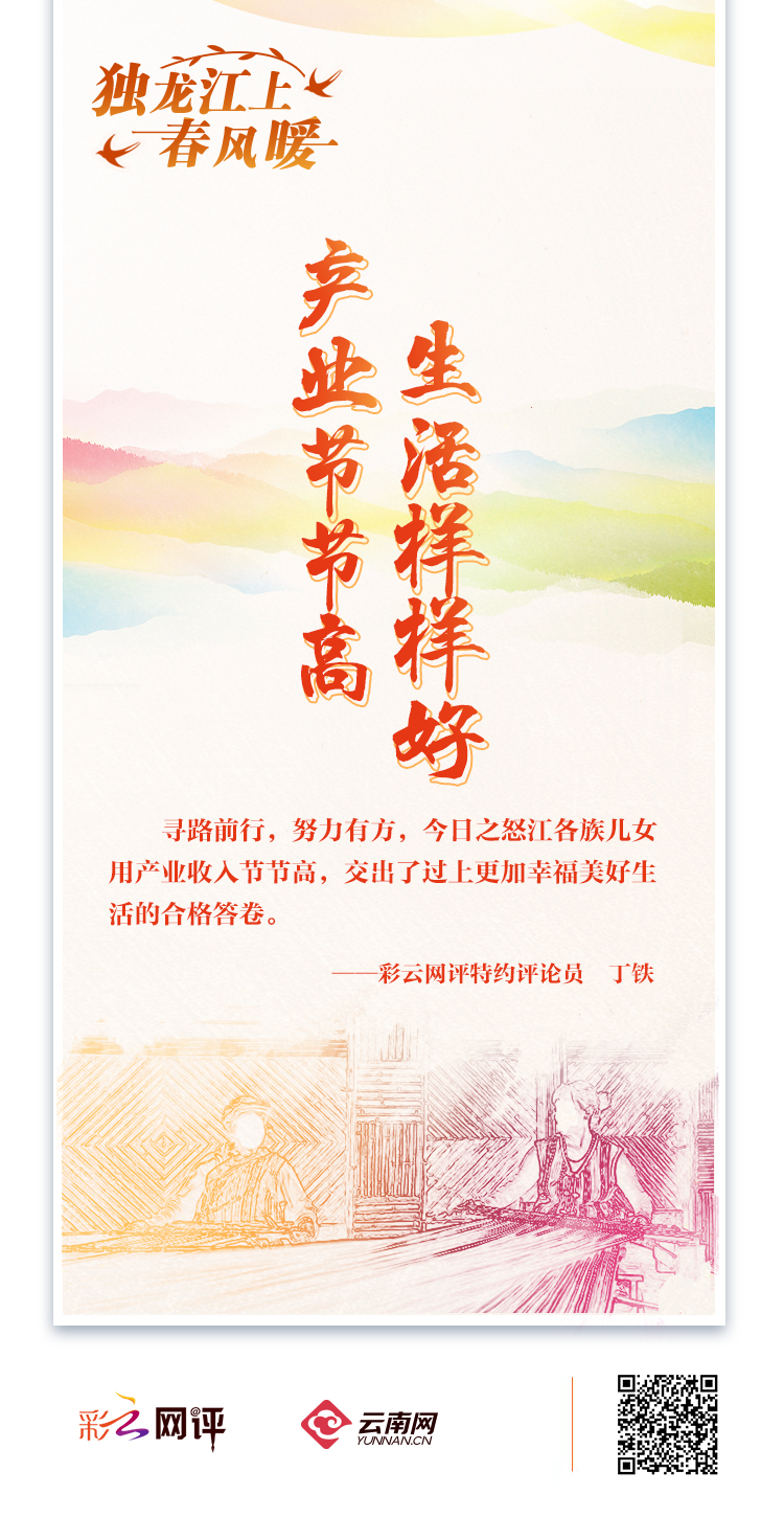 独龙江乡农民人均经济纯收入从2014年的2236元增长至2023年的18244元。户均存款超过5万元,90%以上的独龙族群众有存款、92%以上的家庭拥有机动车,集体经济收入逐年攀升……独龙江上春风暖,感恩奋进正当时,寻路前行,努力有方,今日之怒江各族儿女获得感成色更足、幸福感更可持续,未来更可期。