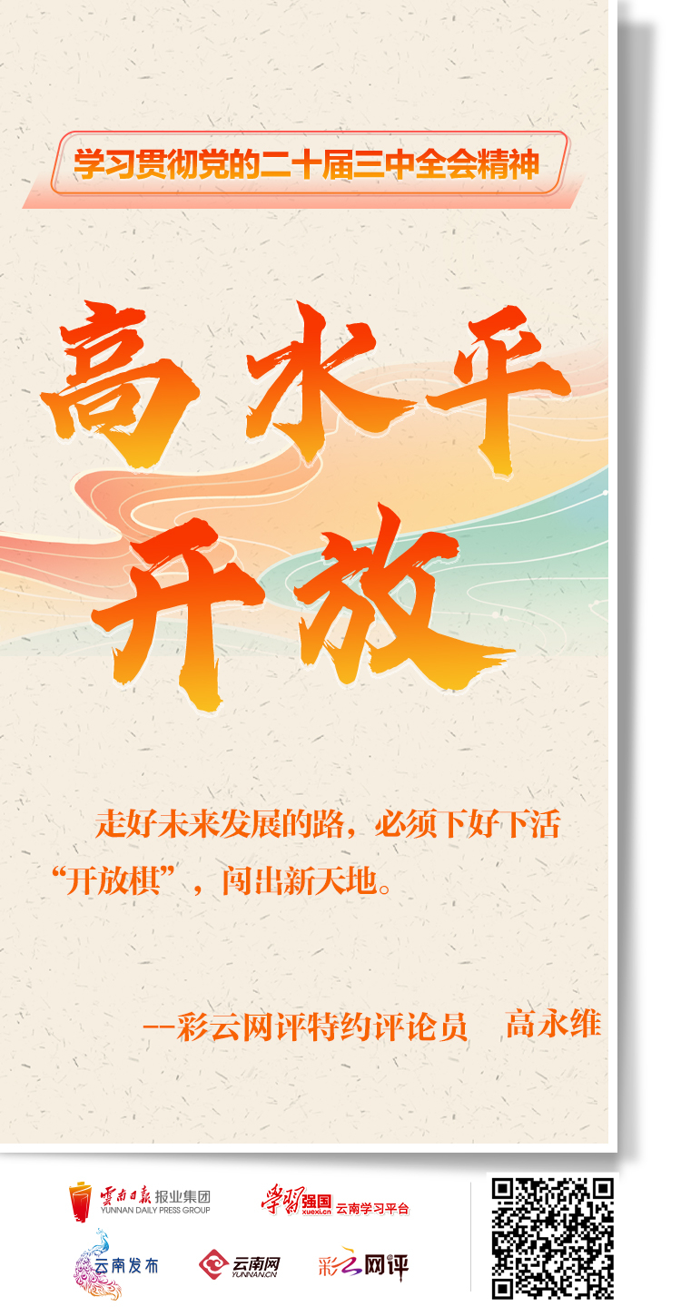 为深入学习贯彻党的二十届三中全会和省委十一届六次全会精神,进一步发挥网评工作统一思想、凝聚共识、汇聚力量的积极作用,推动全会精神在云岭大地深入人心、落地生根,8月9日起,云南网彩云网评持续推出“深入学习贯彻党的二十届三中全会精神”系列“海报+”新媒体评论产品,聚焦云南全面深化改革、推进中国式现代化中的痛点、堵点,说创新举措、谈发展路径,为谱写好中国式现代化云南篇章营造良好舆论氛围、提供有力思想舆论支持。