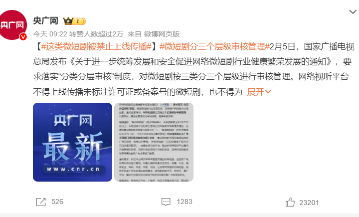 近日,国家广播电视总局发布《关于进一步统筹发展和安全促进网络微短剧行业健康繁荣发展的通知》,要求落实“分类分层审核”制度。根据微短剧行业发展实际,按照国产网络剧片分级监管、重点监管原则,对微短剧按三类分三个层级进行审核管理,以差异化、精准化管理优化审核流程、提高审核效率。