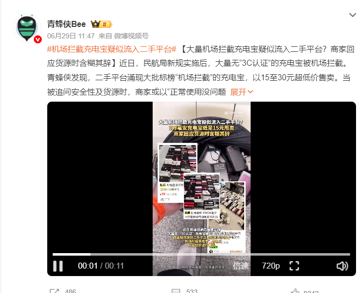 然而,新规落地后“被拦截充电宝去向”问题却引发公众猜疑。据媒体爆料,二手平台上大量标榜“机场拦截安检扣押”的低价充电宝涌现,售价仅 15 至 30 元。当被追问安全性及货源时,商家要么以“正常使用没问题”搪塞,要么以“正规渠道回收”敷衍。这种来路不明充电宝的流通,不仅可能让不合规产品重新流入市场,更消解着公众对规则的信任。