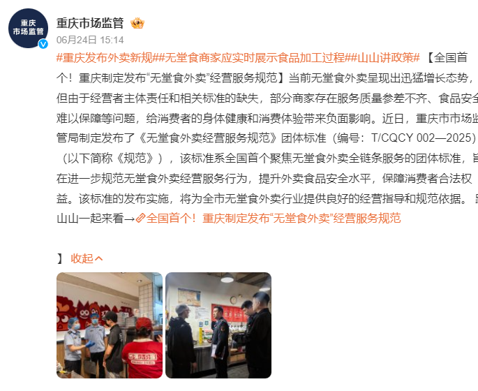 近日,重庆市市场监管局制定发布《无堂食外卖经营服务规范》(以下简称《规范》)团体标准。该标准是全国首个聚焦无堂食外卖全链条服务的团体标准,旨在进一步规范无堂食外卖经营服务行为,提升外卖食品安全水平,已于2025年7月1日正式实施。
