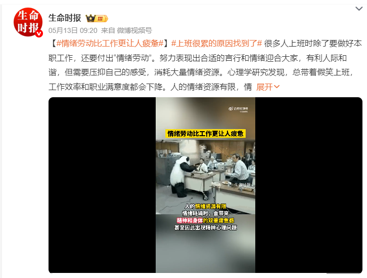 《2025中国职场情绪报告》显示,83.7%的受访者认为“情绪劳动已不限于服务行业”;65.4%的互联网从业者把“线上秒回、语气友好”列为加班之外的第二大负担。2024年6月,海一家咖啡店员工向顾客泼咖啡粉的事件引发关注。事件曝光后,媒体调查发现,该店人手严重不足,员工职责多而杂,一直处于情绪高压状态,被顾客投诉3次就面临解雇风险。类似事件,近年来常有发生,过载的情绪劳动让人身心俱疲,负面的情绪或是在某件小事中全线爆发,或者一直隐忍进而变成疾病。