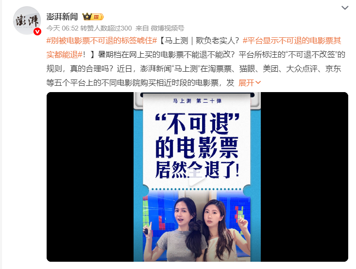 近日,澎湃新闻“马上测”在淘票票、猫眼、美团、大众点评、京东等五个平台上的不同电影院购买相近时段的电影票,发现即使标注着“不支持退票、不支持改签”的电影票,通过向客服申诉、拨打影院和平台电话等渠道后,都能100%退款。平台专挑信任自己的老实人欺负,着实有些太明显。