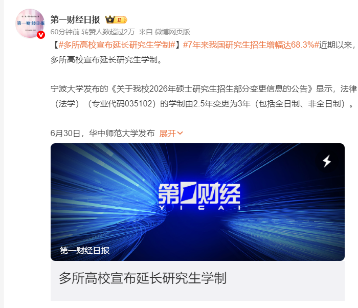 近日,多所高校宣布延长研究生学制。其中,宁波大学法律(法学)学制由2.5年变更为3年(包括全日制、非全日制),华中师范大学全日制社会工作专业、江西财经大学应用统计和金融专硕学制将从2年调整为3年。中央民族大学、吉林师范大学、南昌大学等也有部分专业做出类似调整。