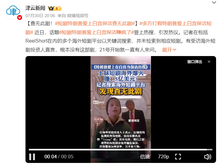 近日,多家新闻网站和社交平台广泛传播一则消息,称 “短剧《特朗普爱上白宫保洁》在海外火了,美国观众边骂边付费追剧,该剧在三个月内狂收1.5亿美元。”