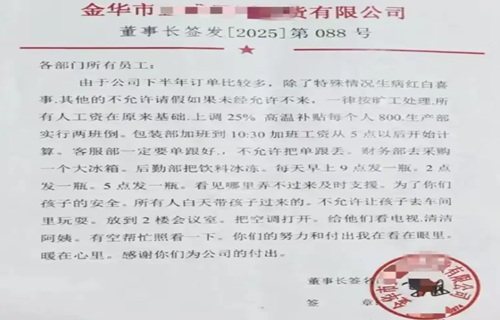 近日,浙江金华市某公司董事长签发的一份内部“红头文件”在社交平台传播后迅速走红。文件中明确了加班制度、全员加薪、高温补贴发放等内容,还特别允许员工“带娃上班”,这一举措引发网友热议,不少人点评此举充满“人情味”。