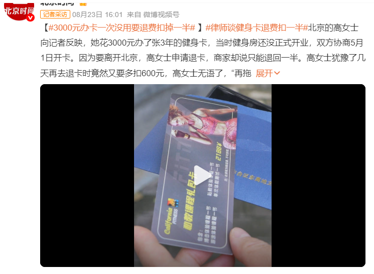 一张原价3000元的健身卡,因消费者工作调动申请退费,却被告知需扣除 35% 的手续费。近日,上海市民陈女士健身卡退费的经历引发广泛关注:她花费8.4万元购买私教课,后因腰椎间盘突出无法继续健身,拿着医院诊断结果与机构协商退款时,却被告知需按协议约定承担总金额5% 的手续费和30% 的违约金,两项费用共计29400元。