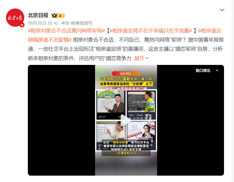 近期,一些社交平台上出现标注“相亲鉴定师”的直播间。这些主播以“婚恋军师”自居,分析前来相亲对象的条件、评估用户的“婚恋竞争力”,受到不少网友追捧。