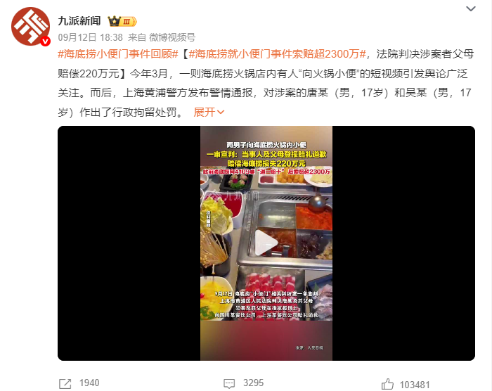 今年3月,一则海底捞火锅店内有人“向火锅内小便”的短视频引发广泛关注。近日,上海市黄浦区人民法院作出判决,判令唐某、吴某及其父母向海底捞方面赔礼道歉;唐某父母、吴某父母需赔偿餐具损耗费和清洗消毒费13万元,赔偿经营损失、商誉损失200万元及维权开支7万元,三项费用共计220万元。