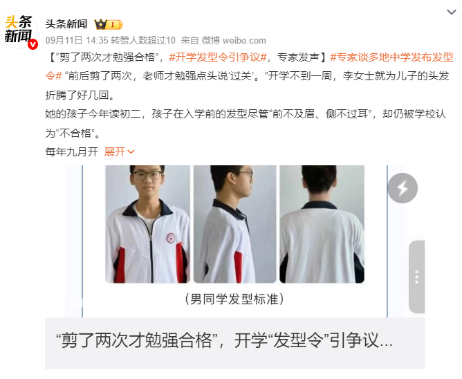 “前后剪了两次,老师才勉强点头说‘过关’。”开学不到一周,李女士就为儿子的头发折腾了好几回。每年九月开学季,类似的情景就会在全国多地上演。近日,媒体梳理发现,全国多地中学均在开学前陆续发布了“发型令”,对男女生的发型提出要求,将其视为开学前的“标配”动作,这也成为一种屡见不鲜的现象。