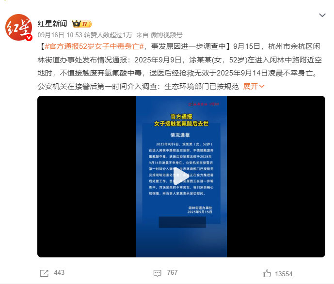 近日,52 岁女子涂某某在杭州余杭区闲林中路附近空地活动时,不慎接触废弃氢氟酸后中毒,送医抢救无效身亡。此事件引发广泛关注。当地警方表示,事发现场的氢氟酸已废弃很久,初步判断非恶意投放,后续会继续加强排查。