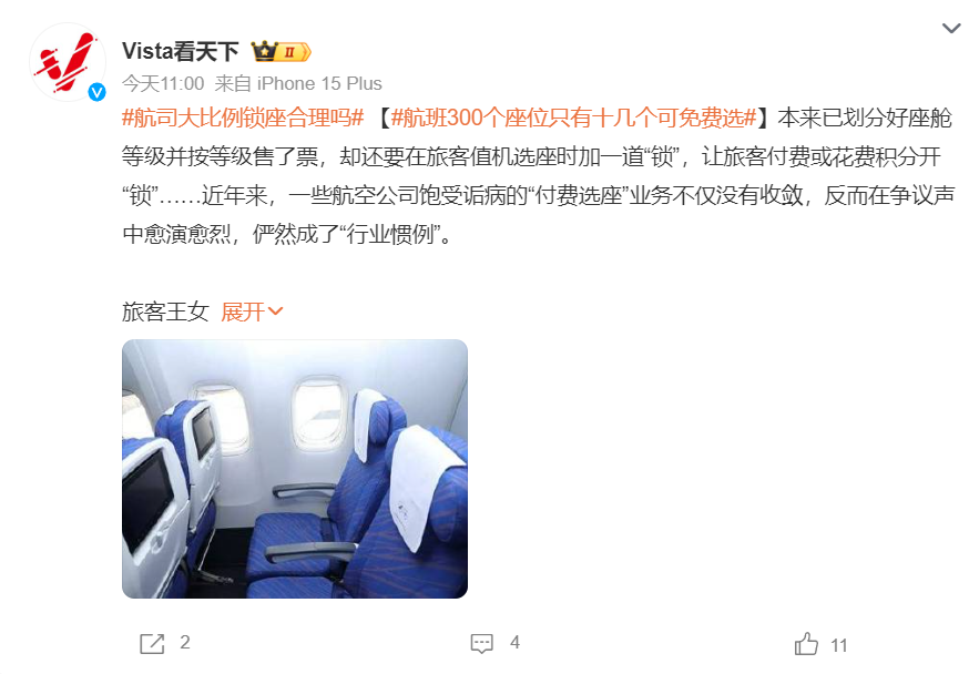 “买票时说是经济舱,值机时才发现经济舱里还有‘付费经济舱’。”今年中秋国庆黄金周前夕,多家媒体集中曝光多家航司在经济舱内大比例“锁座”行为:一架约300座的空客A330,线上值机仅放出116个座位,其中可免费选取的只剩14个,且多为后排中间座位,前20排几乎悉数被“虚拟占座”。旅客若想选靠前、靠窗座位或满足三人同行需求,必须支付35—140元不等的选座费。
