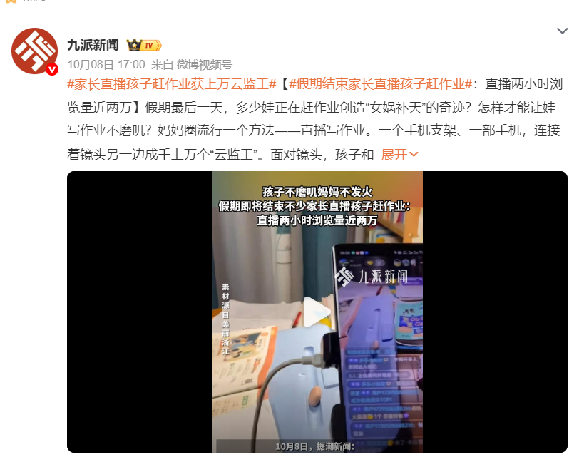怎样才能让娃写作业不磨叽?近期,一种名为“直播写作业”的育儿新潮流正席卷家长圈:手机支架一搭,直播间一开,孩子在镜头前写作业,成千上万的“云监工”在线围观、点赞送花。有网友认为,直播写作业调动了孩子的主观能动性;也有网友认为,若孩子只在镜头前才认真,那培养的不是自主学习习惯,而是“表演型认真”。